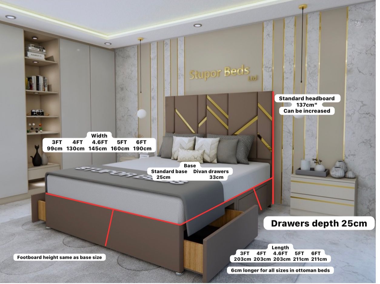 • Super King (6’0 / 180cm x 200cm): Ultimate luxury with maximum drawer storage